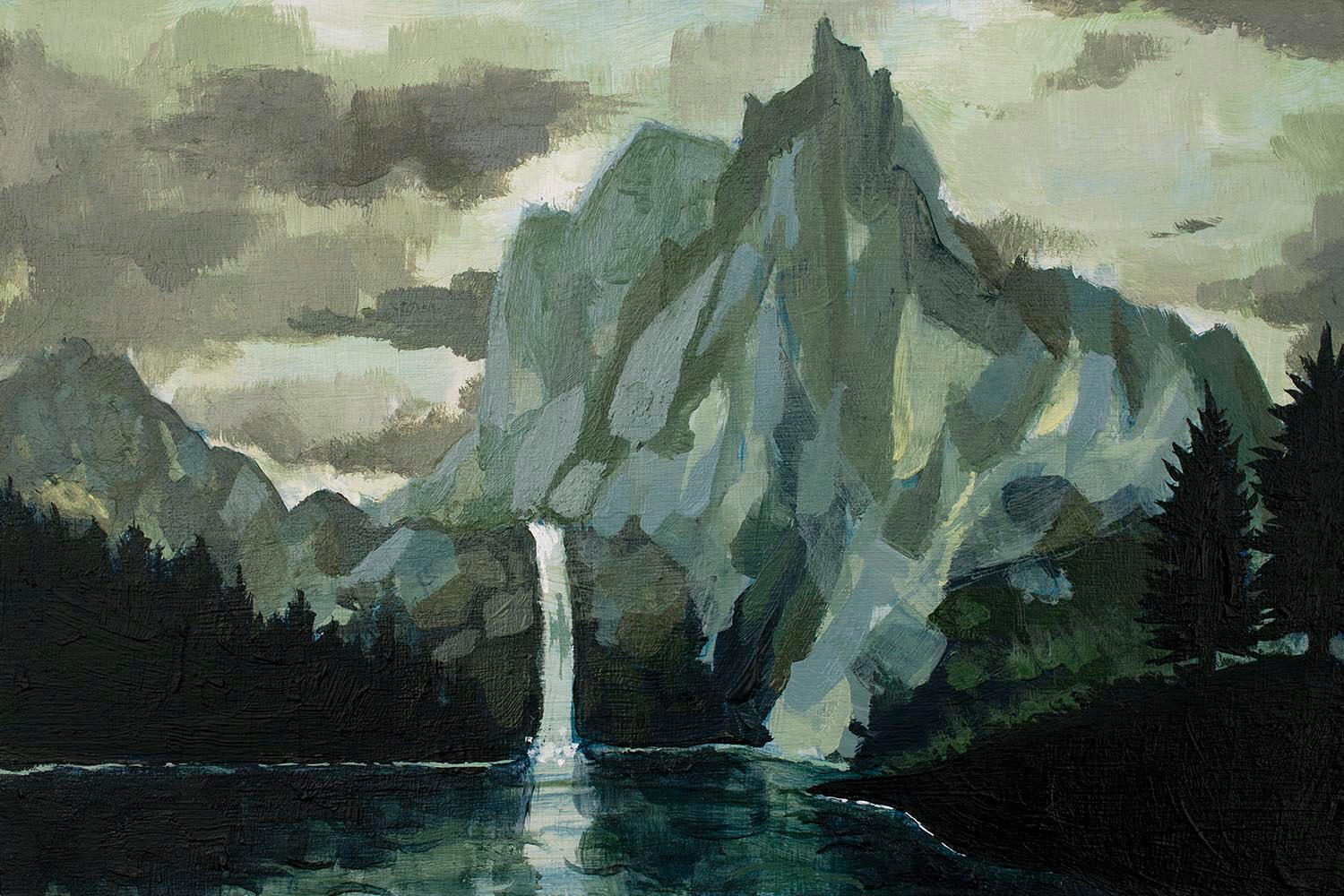 For my landscape work, I think of each piece as a glimpse into a different part of the same universe. These environments aren’t necessarily designed to represent a specific place, but to instead embody a feeling. My favorite scenes to paint are atmospheric, picturesque, and have a feeling of seclusion. These places are often beautifully isolated because I find peace within solitude. I aim to create worlds I can get lost in. Ones where I can immerse myself when I need an escape from the mundanity and stressors of life.