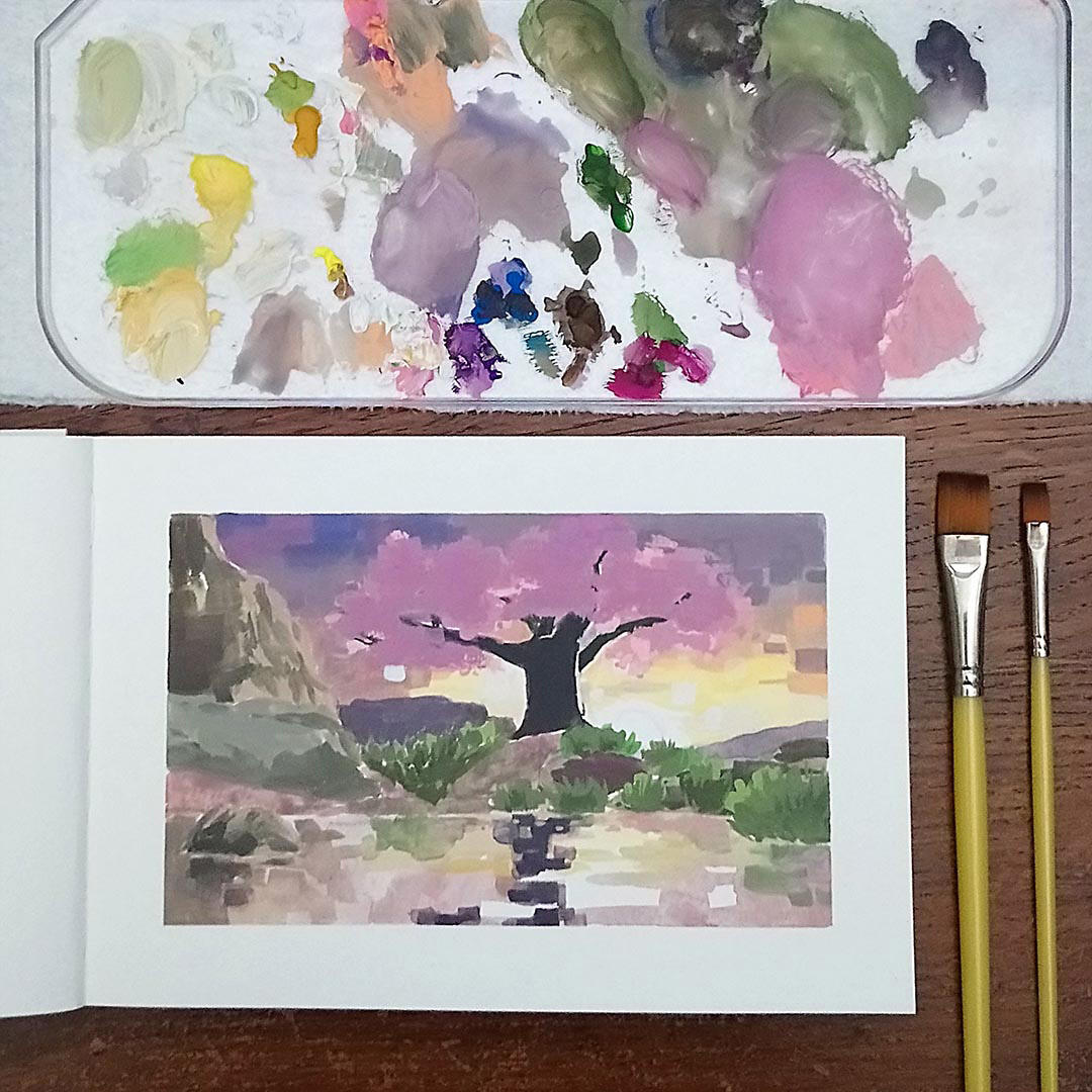 For my landscape work, I think of each piece as a glimpse into a different part of the same universe. These environments aren’t necessarily designed to represent a specific place, but to instead embody a feeling. My favorite scenes to paint are atmospheric, picturesque, and have a feeling of seclusion. These places are often beautifully isolated because I find peace within solitude. I aim to create worlds I can get lost in. Ones where I can immerse myself when I need an escape from the mundanity and stressors of life.